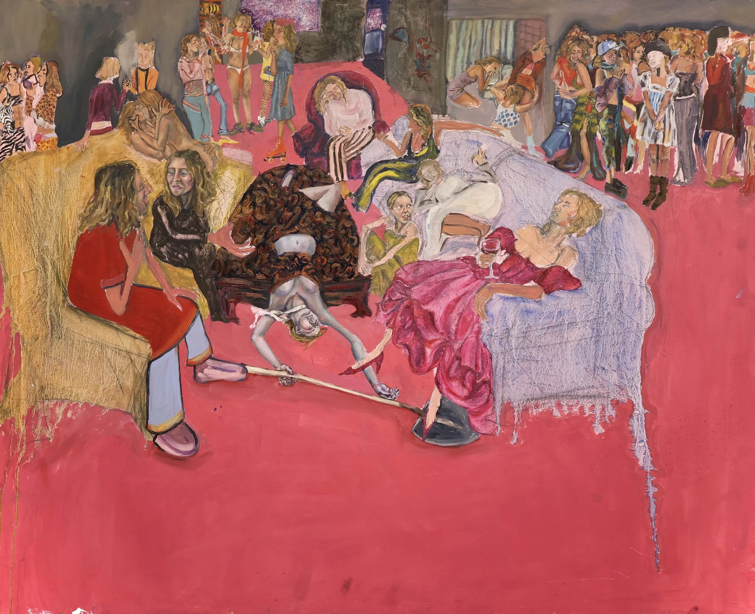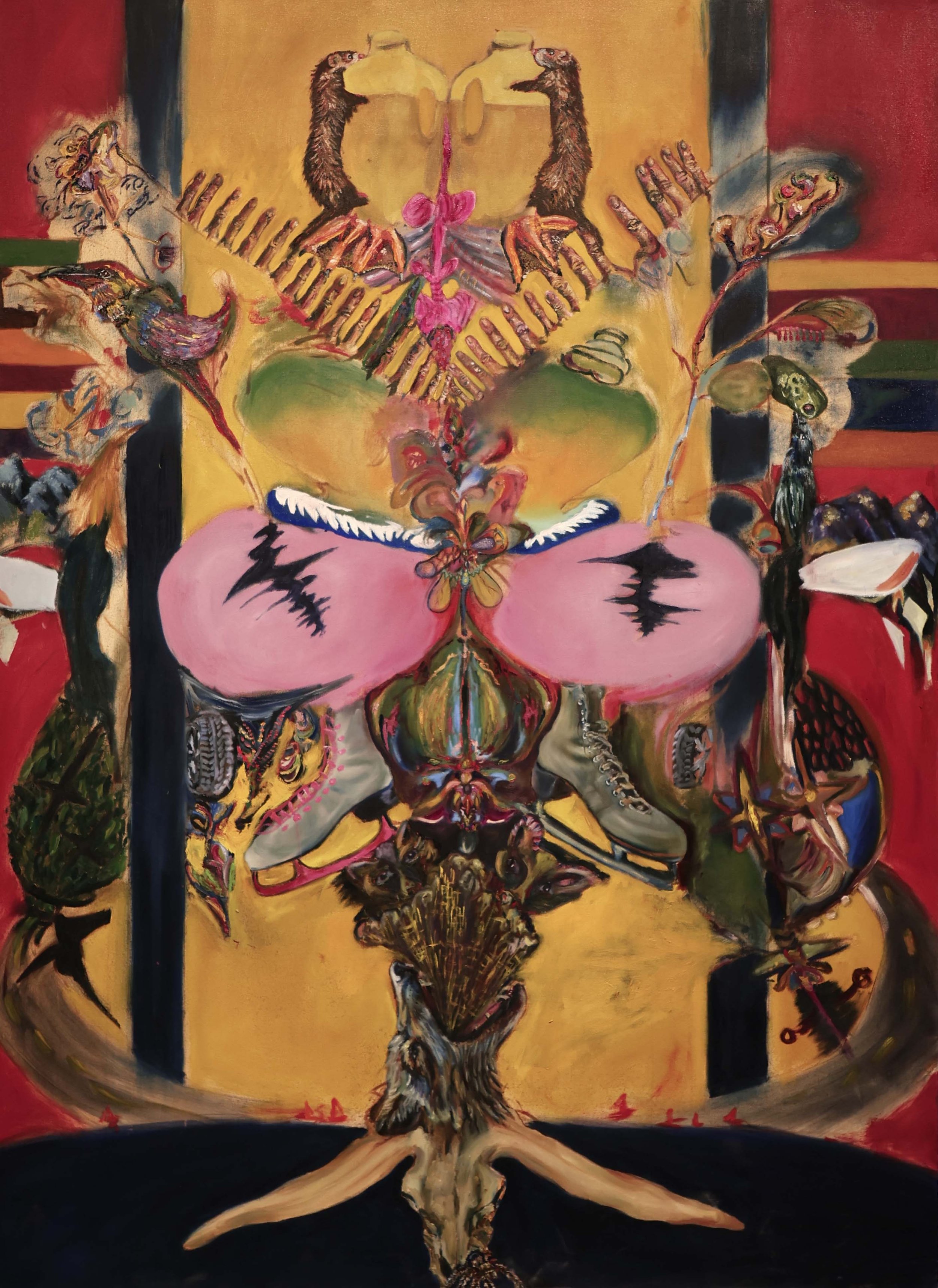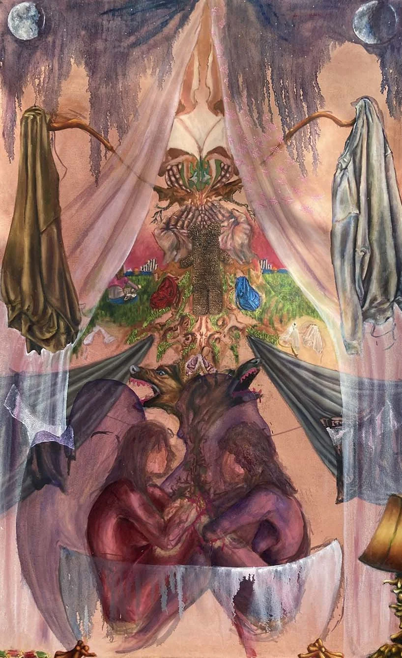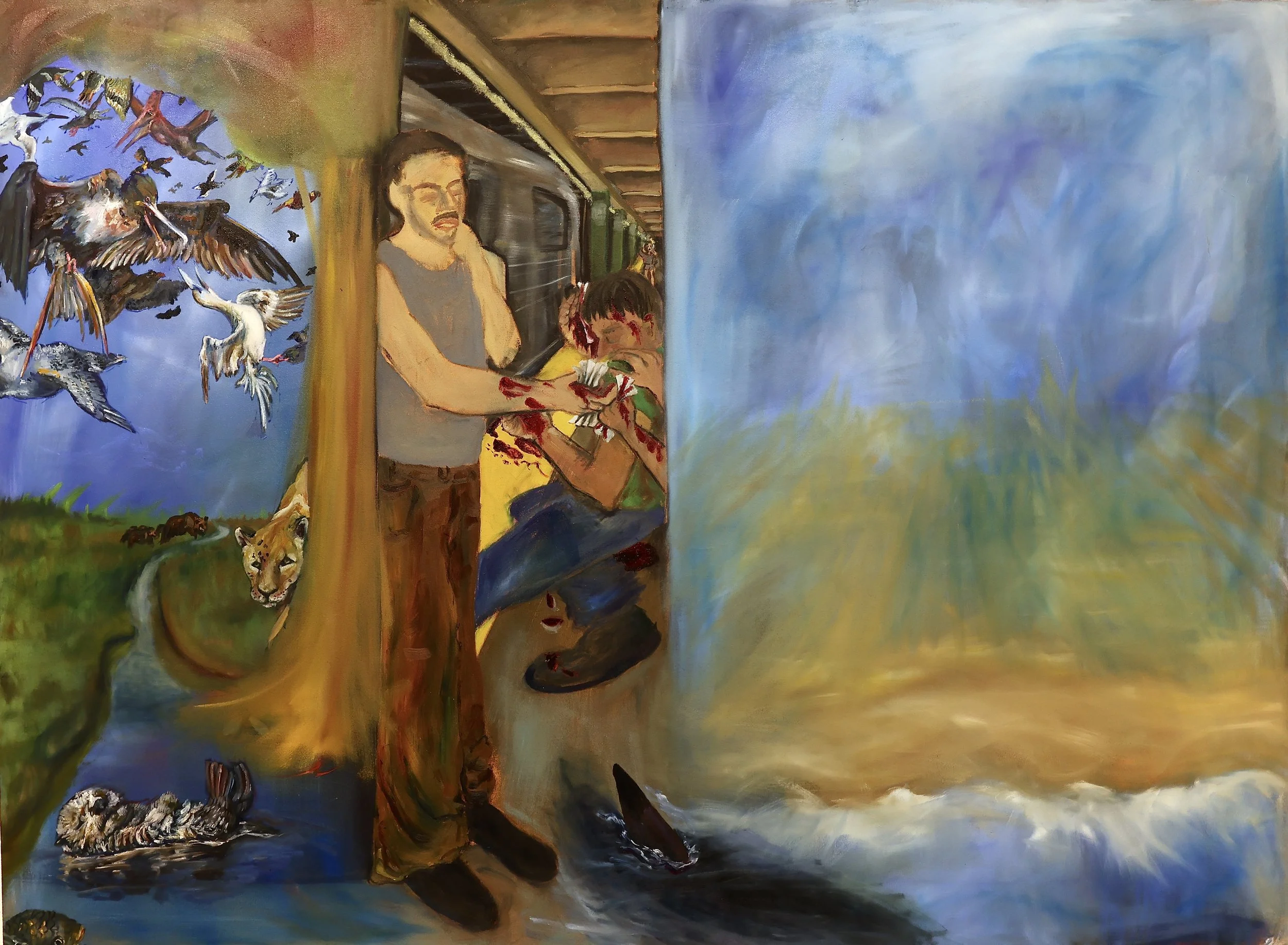 Storytime 2024, Oil on Canvas 60" x 84” DETAILS Waiting in Line for Gabriett 2024, Oil on Wood board, 12” x 60" DETAILS Eating Cher Ami 2024, Oil on canvas 60" x 84” DETAILS A Case for Preservation 2024, Oil on Canvas, 48”x84” DETAILS I Party with Myself (triptych center panel) 2023, Oil and glitter on wood board, 48”x48” TRIPTYCH AND DETAILS Be My Stranger and I'll Be Yours 2024, Oil on Canvas 60" x 84” DETAILS Every Crack in the Sidewalk 2024, Oil on canvas 60" x 48” DETAILS Morning Bath 2024, Oil on canvas 84” x 48” DETAILS The Animals and Me 2024, Oil on wood blocks, 8” x 24” x 24” DETAILS I Need a Vacation from This Vacation 2024, Oil on canvas 12” x 18” DETAILS