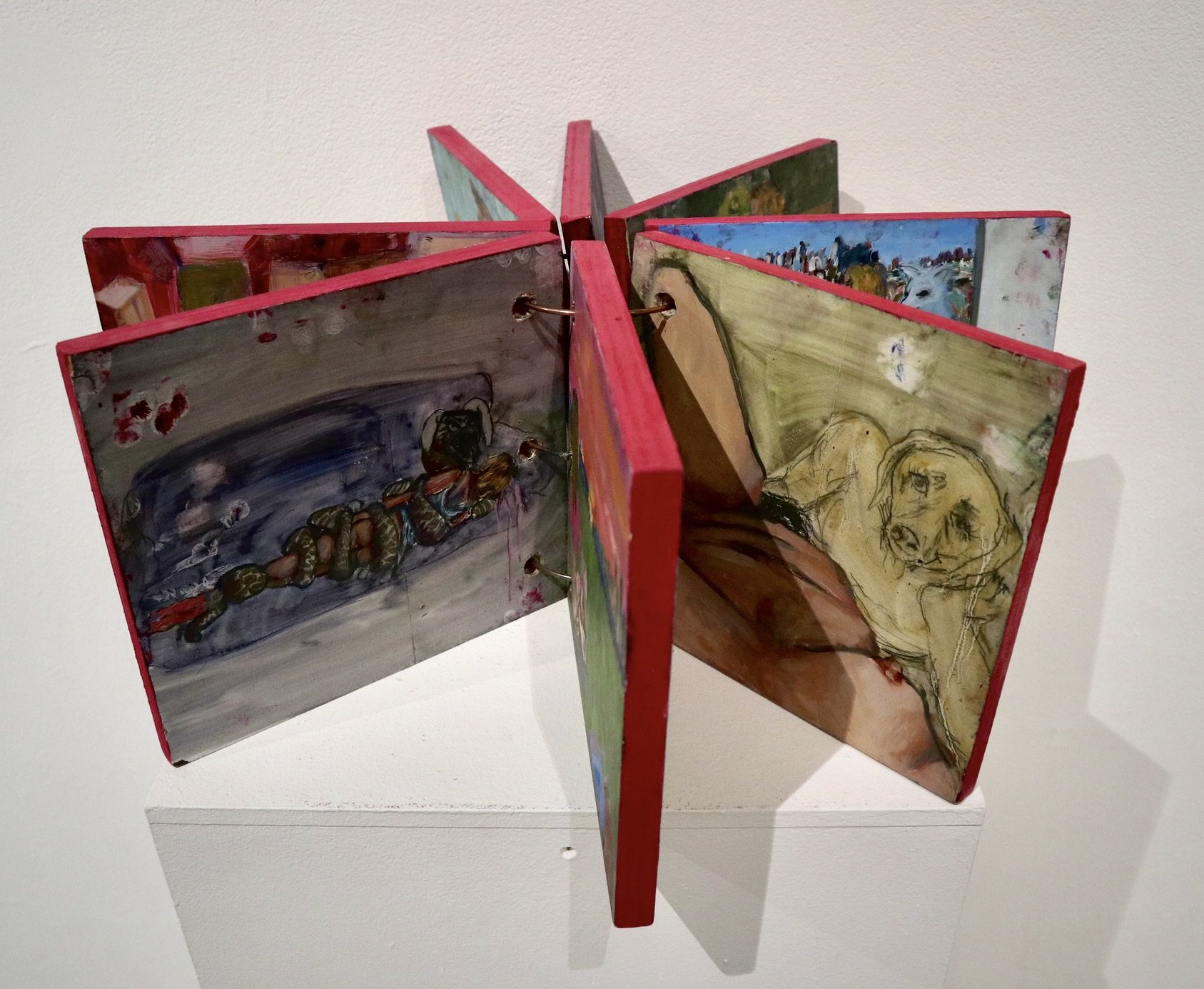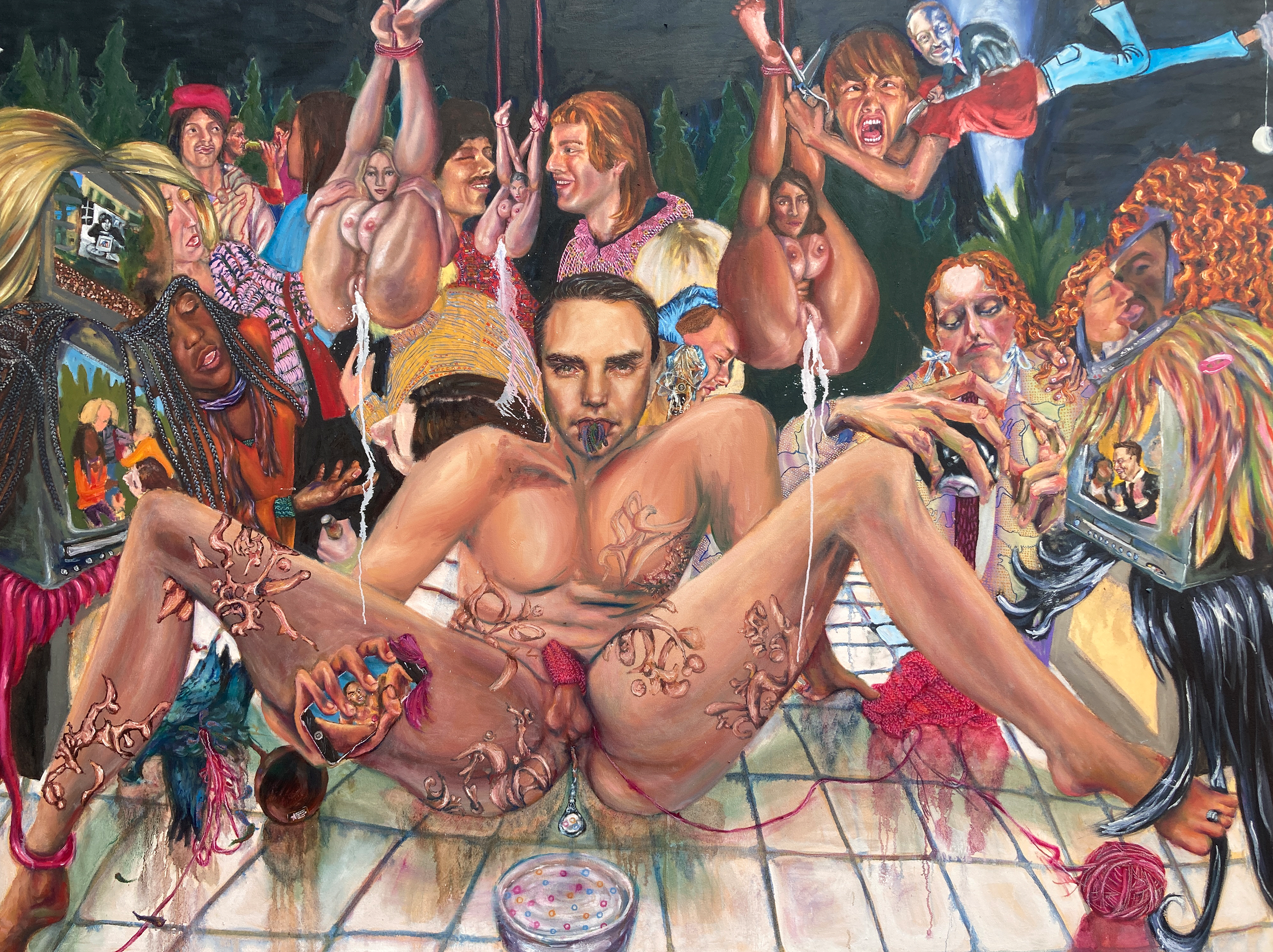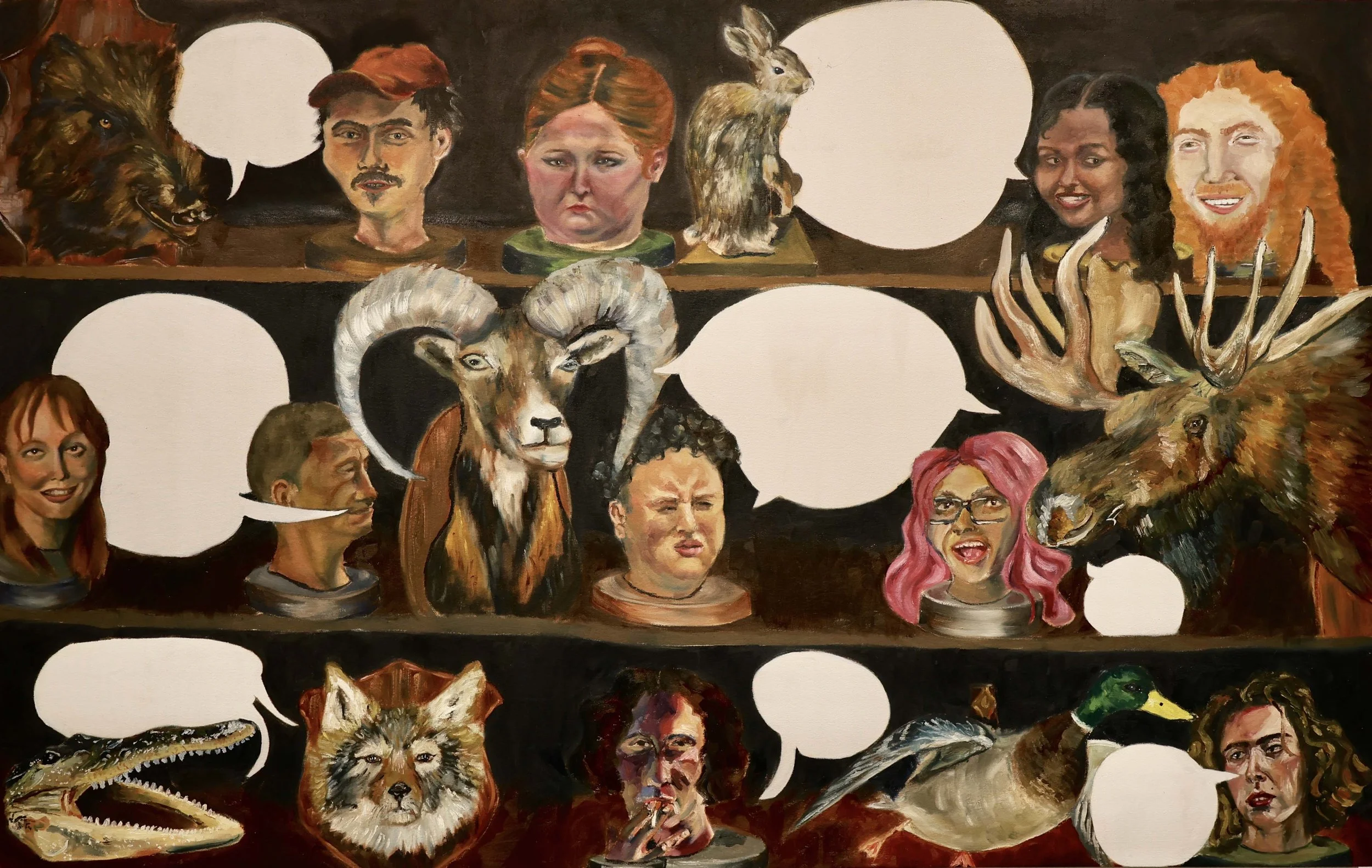 Storytime 2024, Oil on Canvas 60" x 84” DETAILS Waiting in Line for Gabriett 2024, Oil on Wood board, 12” x 60" DETAILS Eating Cher Ami 2024, Oil on canvas 60" x 84” DETAILS A Case for Preservation 2024, Oil on Canvas, 48”x84” DETAILS I Party with Myself (triptych center panel) 2023, Oil and glitter on wood board, 48”x48” TRIPTYCH AND DETAILS Be My Stranger and I'll Be Yours 2024, Oil on Canvas 60" x 84” DETAILS Every Crack in the Sidewalk 2024, Oil on canvas 60" x 48” DETAILS Morning Bath 2024, Oil on canvas 84” x 48” DETAILS The Animals and Me 2024, Oil on wood blocks, 8” x 24” x 24” DETAILS I Need a Vacation from This Vacation 2024, Oil on canvas 12” x 18” DETAILS